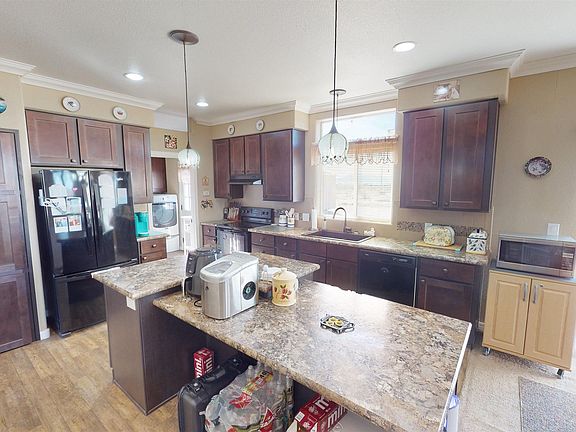 Cavco double wide manufactured home considered Real Property built in 2016 that offers 3 bedrooms, 1 full & 3/4 baths, split floor plan, 1680 SQFT, 28X60, 9 foot ceilings, extra tall windows, & sits on approximately 3.82 acres, refrigerated central air & central heating electric, this home is powered on electric which solar is perfect no more high electric bills perfect for the summer season! There are 3 sheds, that have electric, & insulated. The 3.82 acres are fully fenced, shade trees w irrigation already set up. As you enter into the kitchen w lots of countertop & cabinet space w a walk-in food pantry & beautiful tall cabinet kitchen opens to the living room & dining room. Split floor plan w the two bedrooms & one full bathroom on the West side of the home. Master bedroom w a walk-in closet, ¾ bath w his and hers sink, & built in shelves. Easy access to all your local stores, business, schools, and hospital. Come and enjoy the beautiful night sky views and the peacefulness!