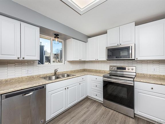 Situated perfectly overlooking expansive open space, this low maintenance condo features two west facing outdoor balconies. Enjoy morning coffee on the balcony or relax in evening as the sun sets. Located on the second floor, this 2 bedroom + 2 bathroom condo has been tastefully updated with many features you are sure to appreciate. The open plan living space is filled with natural light and includes a spacious living room with a wood burning fireplace, dining area and kitchen with stainless steel appliances and designer backsplash. Enter through double doors to the primary suite featuring a 3/4 en-suite bathroom, large walk-in closet and access to one of the private outdoor balconies. There is also a secondary bedroom and full bathroom. Recent updates include new interior paint, new bedroom carpet and LVP flooring in primary bathroom. In unit stackable washer + dryer are included. Ample storage space can be found adjacent to the kitchen and on the outdoor balcony. This condo comes with a partially covered parking space (#6) in addition to guest parking available throughout the complex. Nestled in the Hickory Place community, you are within minutes of Cornerstone Park and all the amenities it has to offer, South Broadway and Downtown Littleton with many wonderful shops and restaurants to enjoy. Easy access to Santa Fe. This condo is move-in ready!