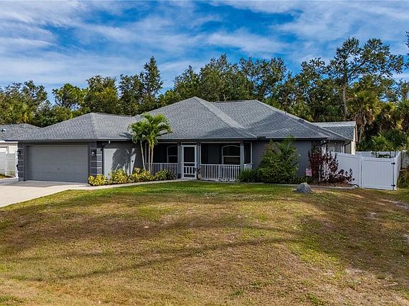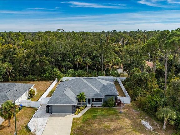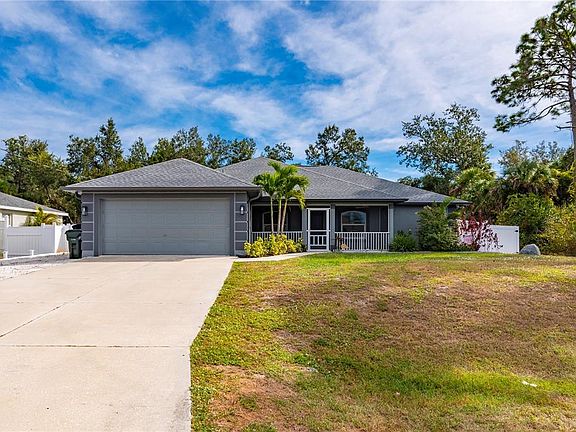 Soft views of surrounding trees create a tranquil backdrop for this inviting, move-in ready North Port 3-bedroom, 2-bath plus den home, showcasing over 2,000 square feet of thoughtfully updated living space including a 2023 remodel that blends modern comfort with timeless style. A spacious screened front porch welcomes you with a sense of ease, leading inside to two dens that can be used as a formal dining area on one side and a bright bonus room on the other - ideal as a home office, study, den, or creative space to suit your lifestyle. The great room opens with vaulted ceilings, recessed lighting, and gentle natural light, flowing seamlessly to a kitchen featuring stainless steel appliances, a breakfast bar, and a cozy dining nook. Neutral updated luxury vinyl flooring flows seamlessly throughout the entire home. The split layout enhances privacy with a generous primary suite complete with dual walk-in closets, and an updated bathroom which includes a walk-in shower with multi-colored lighting, dual vanities, and upgraded LED mirrors. Two additional bedrooms share an updated bath perfect for family and/or guests. The living space is extended onto a back screened lanai perfect for relaxed evenings and gatherings, overlooking a wide fenced yard and serene wooded views. Updates throughout the home include a recently added crushed-shell parking space for boat or RV parking, new roof installed in 2022, AC with blue light (2022), 175 mile per hour triple-pane impact windows (2023), a whole-house reverse osmosis system (2023), instant hot water system (2024), fresh exterior paint (2025), and an extra-large storage shed (2022). Located in North Port, this home combines peaceful surroundings with everyday convenience. You are just minutes from shopping, dining, parks, golf, and recreation, and a short drive brings you to award-winning beaches, the brand new Sunseeker Resort, and major sports venues including Tampa Bay Rays and Atlanta Braves ballparks. With easy access to Interstate 75, Sarasota, and Punta Gorda airports, North Port offers the perfect balance of relaxation and connection.