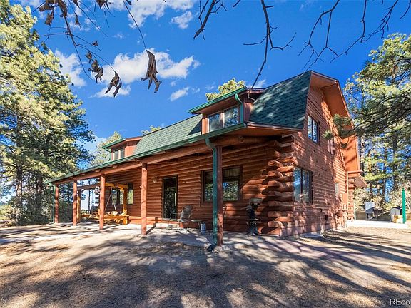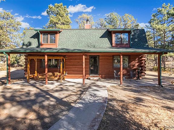 Gorgeous 3000+sf log home nestled amongst towering Ponderosa Pine trees on five secluded acres! With the quintessential covered front porch, great party ready back patio, newer Cleary barn, and two car detached garage, you may never want to leave! The upper level boasts three bedrooms, including the Master Retreat with great natural light and vaults, and two secondary bedrooms (currently connected, and with one being used as an office). There is also an additional full bath on this level. The main level has a nicely sized eat-in kitchen with granite counters and a center island, a large 1/2 bath, and the heart of the home ... the lodge-like family room with beams and a wood stove! The lower level has two nicely sized non-conforming bedrooms (one an en suite), and a large laundry/storage room. All perfectly situated at the end of a quiet cul-de-sac, in the coveted PINES Subdivision, in Elbert County (low taxes). With your private well and septic, generator ready house, and animal pens, you'll be ready for anything! Your new favorite pastime will be sitting on your porch, listening to the wind in the trees and watching the dark skies for shooting stars! Five minutes to post office, shopping, and dining, 25-30 mins to Parker/Castle Rock, and 40 to DTC.