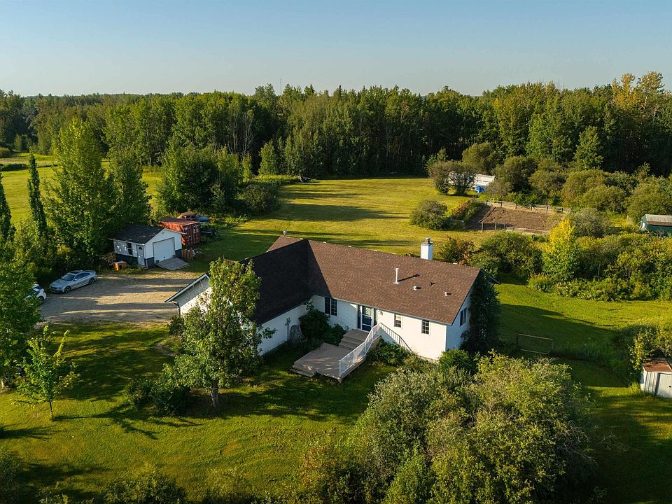 5.46 acres… fully-fenced… with a desirable SOUTH-FACING exposure… this is the acreage you’ve been wanting! Perfectly positioned amongst a tree-lined perimeter, this bungalow features an open layout, large living room & kitchen with sliding patio doors leading to the upper-level deck, main-floor laundry, FIVE total bedrooms including a king-sized owner’s suite with dual closets & 4pc ensuite, a fully-finished WALK-OUT basement with wood-burning fireplace, bar, & stage (yes, a stage! Perfect for dancing, live music, & entertaining!), and an oversized double-attached garage. Complete with a hot tub, lower-level deck, numerous fruit trees & shrubs (apple, cherry, crap apple, raspberries, saskatoon, haskaps, pin cherry, currants, & rhubarb), 3 sheds/outbuildings, and a single-detached garage (ideal for a workshop!), this property is less than 20 minutes from Stony Plain in the Blueberry School district – you’ll love it here!