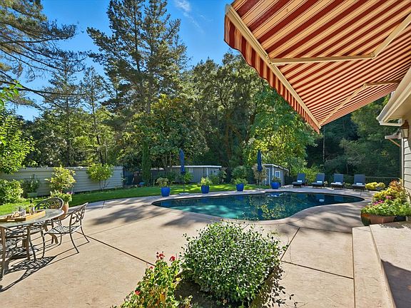 Serene Wine Country retreat surrounded by Nature. Just minutes from Napa's city limits, this gated 5.56 acre property offers a peaceful creekside setting with so much privacy. Your driveway leads to the main house with a dramatic backdrop of lush forest. A sparkling pool, patio, and garden, leads to a covered outdoor living area overlooking the creek and forest. Soak in the peaceful view or wander down to the creek to truly escape. The home features an open great room with vaulted ceilings, walls of windows, and glass doors that invite the outdoors in. The kitchen has gorgeous granite counters & dining bar, LG gas range & hood, Bosch dishwasher, walk-in pantry, and glass-front cabinets. There are 2 spacious bedrooms and 2 baths, including a primary suite with private covered patio, large walk-in closet, double sink vanity, and oversized glass shower. The laundry room provides tons of storage and a deep sink. Detached 2-car garage plus a 1,200 sq ft recreation building with vaulted ceiling, concrete floors, half bath, and granite bar - will be so much fun for entertaining guest. This incredible setting and the comfort of the lovely home makes this the ultimate Napa Valley getaway.
