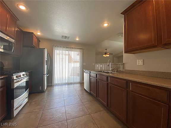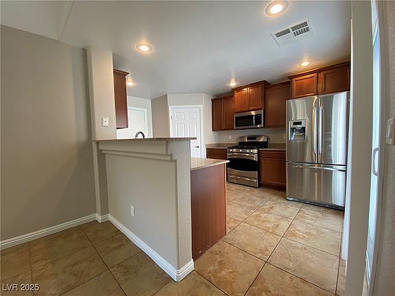 Granite kitchen countersStainless steel appliancesLarge tile flooring