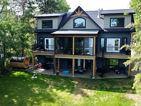 Step into this 2024 Masterclass Waterfront Home on Lake Wabamun—a perfect fusion of modern luxury and natural beauty. The open-concept living area stuns with soaring ceilings, exposed wooden beams, and a striking mezzanine. Light wood flooring enhances the warm ambiance, while expansive windows flood the space with natural light. The gourmet kitchen boasts sleek white cabinetry, quartz countertops, high-end appliances, and a walk-in pantry with a coffee bar. Enjoy breathtaking waterfront views from the dining area or cozy up by the double-faced stone fireplace. Spa-inspired bathrooms blend rustic and contemporary elegance, while spacious bedrooms offer serene outdoor vistas. The screened sunroom is a standout, featuring a picturesque fireplace, comfortable seating, and panoramic lake views—perfect for year-round relaxation. Spanning 3 levels where the attention to detail has been carried through-out top to bottom. This is just the beginning—don't miss your chance to make this dream home your reality!