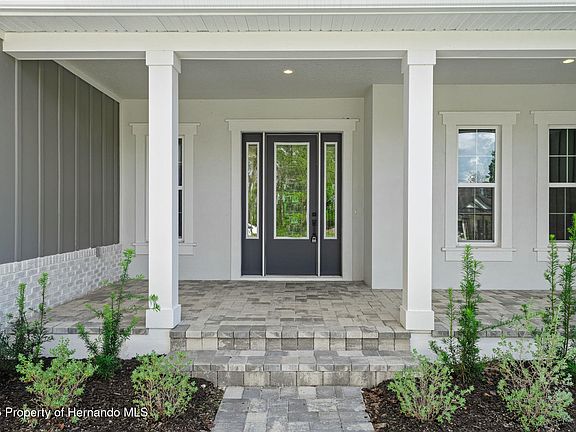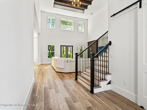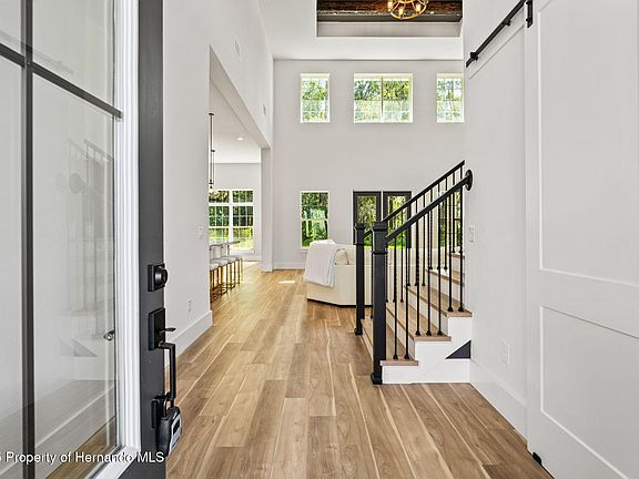Experience unparalleled elegance in this custom-built, one-of-a-kind 5-bedroom, 3-bathroom luxury home nestled within the prestigious Southern Hills Plantation Club, set along the iconic Pete Dye-designed 18-hole golf course. This stunning 2-story residence welcomes you with soaring 22' ceilings, custom beams, and expansive second-story windows that flood the space with natural light, highlighting an exquisite living room adorned with a striking porcelain and oak paneling feature wall. The gourmet kitchen is a chef's dream, featuring a sleek porcelain island, sophisticated under- and above-cabinet lighting, a top-of-the-line Z-Line appliance package, a gas cooktop and oven, and an additional wall oven. Above the spacious 2-car garage, a versatile converted loft space offers endless possibilities—perfect as a theater room, game room, wellness retreat, or anything you can imagine! Outside, beautifully paved front and back patios provide serene spots to relax, with views of a neighbor-owned lot, which has been created into a botanical garden next door and an undeveloped lot across the street, ensuring exceptional privacy and tranquility. Residents enjoy exclusive access to Southern Hills' resort-style amenities, including a par-3 walking course, putting greens, pro shop, clubhouse, pool, spa, poolside dining, gym, pickleball, and Har-Tru tennis courts—all just under an hour from Tampa. This architectural gem seamlessly blends modern sophistication with timeless luxury. Call today to schedule a private tour of this extraordinary home!
