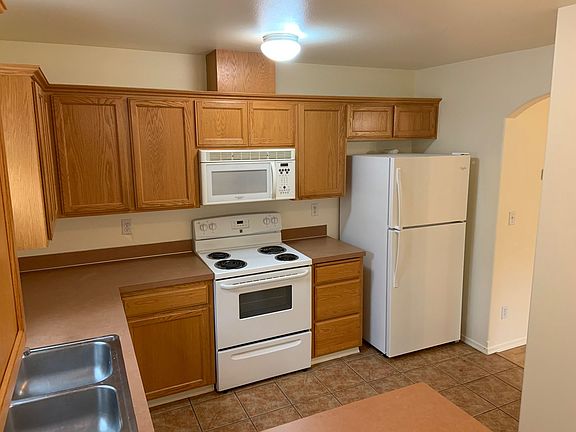 Inside you'll find laminate and vinyl flooring throughout, a recently completed interior paint refresh, and vaulted ceilings that create a bright, open feel. The kitchen comes equipped with a refrigerator, stove, and microwave. The primary bedroom features a walk-in closet and ceiling fan for added comfort.