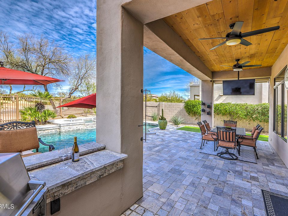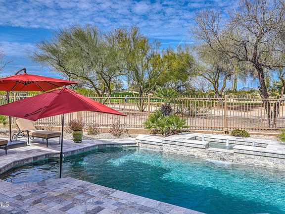 Views, Location, Luxury! This stunning home has it all! On a cul-de-sac, nestled against holes 13 and 14 on the Wildfire Golf course with beautiful mountain views, the backyard includes sparkling pool, water feature and outdoor kitchen. Home is updated and upgraded with gorgeous kitchen including espresso cabinets w/ pull-outs, granite, stainless steel appliances, dual ovens, gas cooktop. First floor guest bedroom w/ a full bath, too!! Large primary retreat w/ spa like bath including fabulous tiled, walk in shower, soaking tub and dual vanities. Soaring ceilings, high end light fixtures and fans, Wtr softner, plantation shutters through-out, epoxy garage floor, lots of storage, too. 2 guest rooms upstairs are joined by a jack/jill bathroom. Well maintained and move in ready!! Easy access to the 101 and 51-close to shopping and restaurants, too. Walking paths, biking and hiking all nearby!