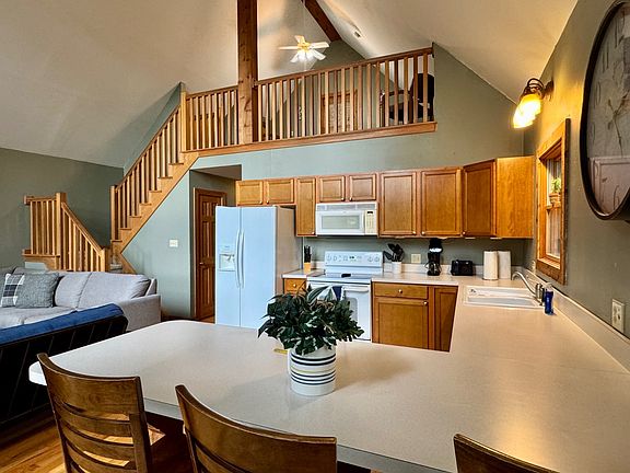Cabin with water view! Full time or summer fun. This 1 bedroom cabin features 768 sf on the main level with another 200 sf upstairs in the sleeping loft area. Main level has a spacious primary bedroom with double closets, full bathroom with tub/shower combo and full size washer & dryer, the great room features a vaulted ceiling filling the living room and kitchen with light from the full wall of windows. Step out onto the large front deck that overlooks the wooded land with water views of Deer Creek. Located above Rocky Point Marina and next to Blue Heron Winery and the Celtic Cross.