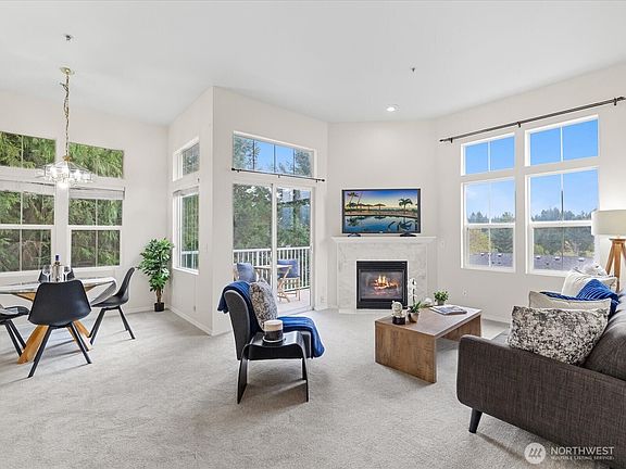 This gorgeous 2 bed, 2 bath end unit townhome sits atop the neighborhood with sweeping views of Tiger Mountain and the surrounding area. Light and bright throughout, it features 10’+ ceilings, an open kitchen with breakfast bar, separate dining area, and a cozy living room with gas fireplace. The spacious primary suite easily accommodates a king bed and includes a walk-in closet and full en suite bath. Freshly updated with new carpet, flooring, and interior paint, plus in-home washer/dryer. No parking worries with an attached garage and plenty of storage. Easy I-90 access, close to shopping, dining, and Issaquah schools! No rental cap and pets allowed! Staging has been removed. HOA dues include water, sewer, common area maintenance.