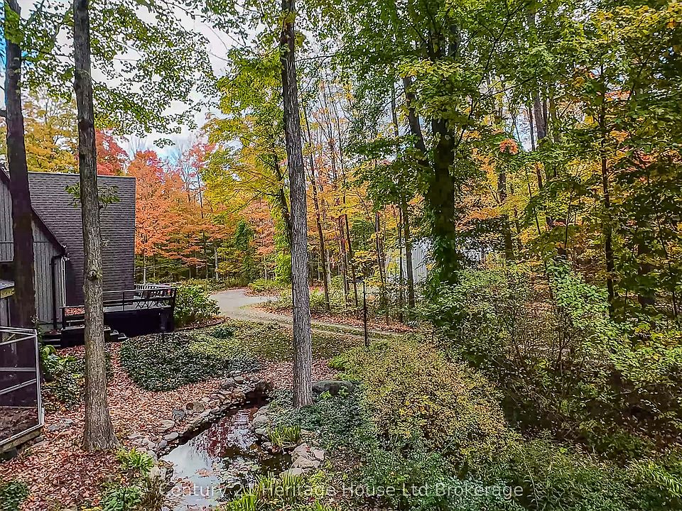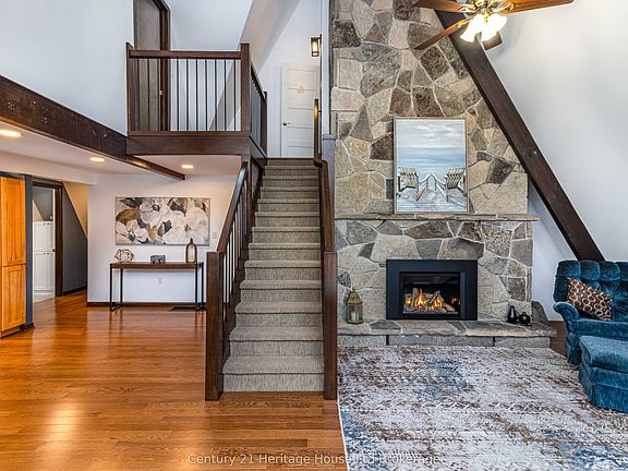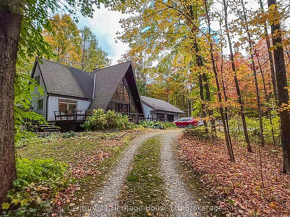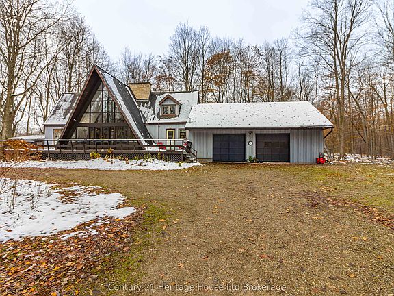 Country roads leading you home. Nestled and tucked away on a wooded 2.7 acres just south of Woodstock in Oxford Centre, this property offers the perfect blend of serenity and style. Along the tree lined winding landway, you'll find two small fish ponds and a spacious campfire area-an idyllic setting for peaceful mornings or evenings spent under the stars.The property features a unique and beautiful detached A-frame home, showcasing a soaring two-story stone fireplace, wraparound decks, and open-concept main floor living. The bright kitchen with the floor to ceiling windows flows nicely into the living area, perfect for entertaining. A separate formal dining room with gleaming hardwood floors also found throughout the main level. The main floor is complemented with an additional office space with direct exterior access making this the perfect spot for those who work from home. An updated bathroom completes the main floor with private views of nature in every direction. Upstairs, the impressive primary retreat includes a second fireplace, a six-piece ensuite, and a walk-in closet along with an additional bedroom . Both rooms feature unique custom architectural roof lines The lower level offers a spacious family room complete with a wet bar, wood burning fireplace, a 3rd bedroom, and a den-ideal for in-law potential-with a walk-up basement leading to the oversized double-car attached garage. Outside, you'll find a large 25' x 40' Quonset building with an RV hookup, a wraparound laneway with ample parking, tons of storage, and unmatched privacy. Don't miss your chance to experience this one-of-a-kind country retreat