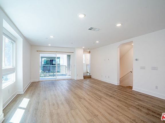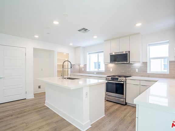Beautiful gated end-unit townhome in Valley Village! This 3-story residence offers 3 bedrooms plus a versatile flex room and 3.5 baths on a charming tree-lined street. The first floor includes a private ensuite bedroom, while the second floor features an open-concept layout with a modern kitchen, functional island, walk-in pantry, and spacious living room surrounded by three walls of windows. A private balcony with a natural gas BBQ hookup makes entertaining easy. Hardwood floors flow throughout, and the discreet laundry area keeps the space organized. Upstairs, additional bedrooms and a flex room provide a private retreat, ideal for an office, gym, or playroom. Smart-home features include a Ring doorbell, keyless entry, and a 2-car side-by-side attached garage pre-wired for EV charging. Conveniently located near the 170, 405, and 101 freeways and just minutes from Universal CityWalk, dining, and shopping, this home offers the perfect combination of comfort, privacy, and convenience.