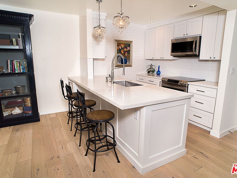 Stylishly remodeled condo located in the highly desirable Vally Village neighborhood. High-end, quality upgrades including quartz counter tops, white oak hardwood floors, marble bathroom floors, ceramic tile in both bathrooms, and Grohe bathroom fixtures. Open-concept kitchen includes Samsung Chefs Collection range and microwave, and Samsung refrigerator and dishwasher. Light and bright floor-plan with no shared walls, recessed and under-cabinet lighting, and 2 en suites on separate sides of the unit. European "all-in-one" washer/dryer in the unit, with storage shelving. Bright and cheery balcony looking out to a small garden and plum tree. Well maintained building offers a year-round heated pool, spa and gym. Walking distance to trendy restaurants and shops. Easy access to the 101 and 170 freeways.
