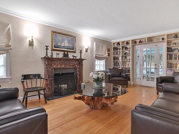 Standout features include: a columned entry portico; center hall; living room with wood-burning fireplace (graced with a burgundy Rosso Levanto marble mantle imported from Belfast), custom built-in bookcases and a French door to the conservatory with a cozy potbelly gas stove; formal dining room; windowed center-island kitchen with 2 skylights, quartz countertops, German cabinetry, stainless-steel appliances (6-burner Wolf stove, Sub-Zero refrigerator, Sub-Zero freezer, Cove dishwasher, Wolf microwave and a wine cooler); master bedroom suite with 3 closets (including a windowed walk-in); master bathroom with a glass-walled shower.