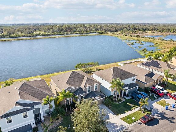 One or more photo(s) has been virtually staged. Spacious 6-bedroom, 3-bathroom waterfront home is one of the largest floor plans in the gated Mira Lago community—offering over 3,000 sqft of beautifully refreshed living space. With new luxury vinyl plank flooring, new carpet, fresh interior paint, and a brand-new A/C system, this home feels like new! The main floor features a formal living and dining area, plus a large open-concept kitchen with granite countertops, 42” wood cabinets, New refrigerator and range, an island, two pantries, built-in desk, and both a breakfast bar and eat-in dining area. The kitchen opens to an additional expansive family room, where large sliding glass doors lead to a covered patio overlooking a serene pond—perfect for entertaining or relaxing outdoors. Downstairs features a full bedroom and bath, ideal for guests or multi-generational living. Upstairs, the oversized primary suite offers two walk-in closets and a luxurious en-suite bath with garden tub, walk-in shower, double vanity with makeup space and private water closet. All secondary bedrooms are generously sized with ceiling fans and ample closet space, and the laundry room is conveniently located upstairs. Mira Lago is a private, gated community offering a resort-style pool, playground, and basketball court—all just minutes from local beaches, boat launches, shopping, and dining. Easy access to US-41 and I-75 for commuting to Tampa, St. Pete, or Sarasota. Don’t miss this updated, waterfront gem—schedule your private showing today!