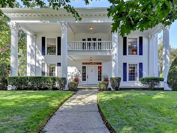 WILLIAM G. THURBER HOUSE (1927) First time on the market in over 45 years! A 2-story stucco Colonial with a low-hip-roof and a stunning portico across the front with a small balcony centered over the front entrance, beautifully sited on a 12,000 sq ft corner lot in the upper Elmgrove neighborhood. The gracious open foyer showcases a splendid staircase, gleaming hardwood floors, and elegant archways leading to the living room, formal dining room, and back of the home. The living room features a handsome working fireplace and tall windows all around to bring in abundant sunlight. The spacious dining room offers a beautiful bow window and the perfect setting for entertaining. The large country kitchen provides plenty of storage and counter space plus a separate breakfast area by a window overlooking the back patio. A powder room and a large mudroom completes the 1st floor. The sweeping staircase leads you up to a delightful sitting room facing the street with access to the balcony. The impressive primary suite has a fireplace, ample closets, and an ensuite bathroom with soaking tub and separate stall shower. There are 3 other generous bedrooms, 2 more full baths, a large closet/dressing room, and a deck on this 2nd level. The lower level provides additional living space with a recreation room and bar area. Convenient oversized integral garage for 2 cars. Excellent condition throughout - all wiring, plumbing, and heating redone in 1979. All replacement windows. An East Side gem!