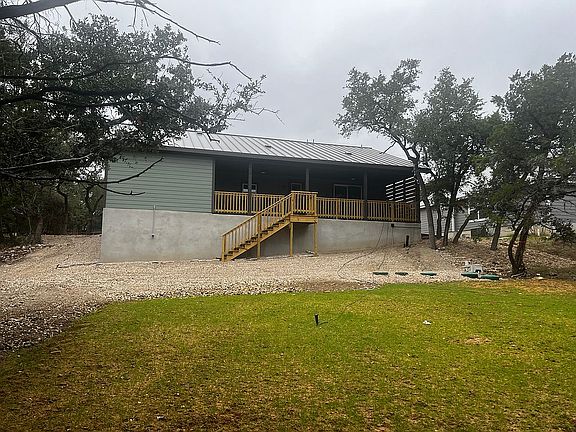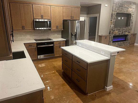 Private outdoor living spaceQuartz countertopsStained wood cabinetsLarge functional kitchenTv nicheLarge covered front patioRaised seam metal roof
