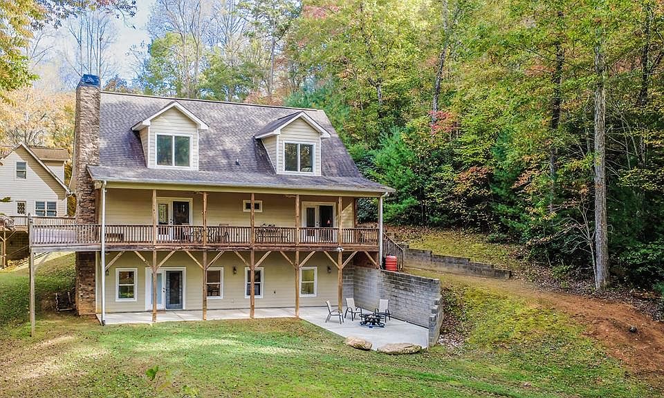 Spacious 4BR/4BA Home on Nearly 3 UNRESTRICTED Acres with FIBER OPTIC INTERNET! Enjoy privacy and convenience in this beautifully designed mountain retreat located on a paved road. This home offers two master suites—one on the main level and another in the loft. The great room features a cozy gas-log fireplace, kitchen boasts abundant cabinetry, and granite countertops. Hardwood floors throughout with tile in the bathrooms. A generous sized main level master with large walk-in closet, and separate shower and soaking tub. The finished walkout basement includes a family room with a wood-burning fireplace, a bedroom, office/craft room, and storage, perfect for in-law suite or family gatherings. Outdoors, multiple springs feed a branch and small creek in front, and the property is bordered on one side by Hanging Dog Creek, known for its trout fishing. Enjoy relaxing on the creekfront deck, tubing or kayaking right from home, or simply soaking in the views of the creek, mountains, and surrounding fields. Set on an elevated bluff with direct creek access (no road easement and not in a floodplain), this home features a wraparound porch, a firepit area, and a detached 2-car garage with an unfinished upper level—framed for a potential 1bd/1.5ba guest suite with electrical already roughed in. Upgrades include Kohler porcelain cast-iron fixtures, a Generac generator, and a 500-gallon buried propane tank. This property truly has it all—creek frontage, mountain views, privacy, and modern comfort—ready for you to make it your mountain sanctuary! Near Blue Ridge, GA and an abundance of hiking, kayaking, quaint shops, the John C. Campbell Folk School, and Harrah's Valley River Casino.