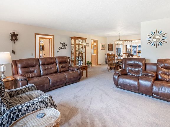 Nestled in an established neighborhood, this sprawling ranch home is inviting from the moment you pull into the drive. Offering over 2000 sq. ft. main floor, you'll fall in love with the expansive front living room with a gorgeous original fireplace and a lovely picture window that streams in all the natural light. With the home sitting just above the rest of the neighborhood, the views are special. Unique for this era of home is an open floor plan that is both welcoming and practical for hosting gatherings year round. A well designed oak kitchen offers ample cabinetry, eat-in dining and beautiful views of the backyard which can also be enjoyed when relaxing in the homes "den." Offering 4 bedrooms main floor with an abundance of closet space, an updated bath, main floor laundry and an additional half bath just off the garage, it's hard to imagine what more one could want in a home. Moving to the lower level, the partially finished family room is comfortable yet the potential to re-imagine the space is endless. Back upstairs, the attached garage offers a drive through door for quick storage access in one of the homes two permanent sheds. A sweet 2 story playhouse awaits for anyone looking for a unique retreat in your own back yard. Perfect for any age! The fenced in yard, patio, and private setting is a welcome surprise as well! New shingles on house/sheds/playhouse 2023, New Furnace/AC March 2024, many replacement windows over the last 8 years too! This home is special and once you walk through, you'll understand why!