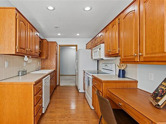 Wonderfully maintained Villa in the 55+ community of the Morningview subdivision. This property is located minutes from from the main road (HWY 58) through Raymore, where there are multiple new shopping locations, restaurants, and awesome highway access! Walking up to the front door you'll see a great sitting porch, through the entry there is a skylight above with high ceilings allowing for natural light illuminating the entry! The kitchen is to the left -it has ample storage and cabinetry, all appliances stay. The garage enters into the main entry hall and through the kitchen is the laundry room. There is an extra room right before you get to the back patio that could be used as an office or hobby room. The living room is large with awesome views to the back yard and a direct view of the front entry area. Both bedrooms have two closets and built in storage, one bedroom has access to a full bathroom. The main hall bathroom has been fitted with a walk in tub making it easier to access than walking over the sides of a traditional tub. The HOA is active with a monthly newsletter outlining community events, clubhouse access for residents and the HOA maintains the lawn, the snow removal, and the property's exterior is up for the HOA to repaint this property in 2026. NEW Roof October 2025, fresh paint and modern fixtures!