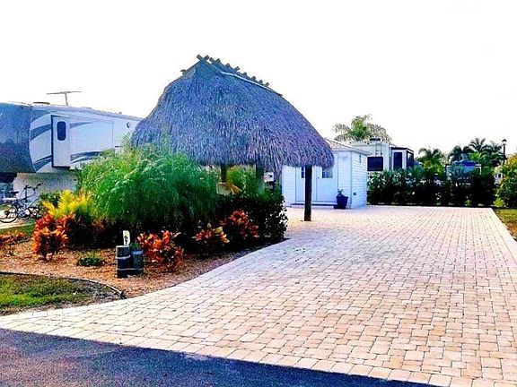 Okeechobee Fl 5 star RV Resort-Silver Palms: Beautiful interior Lot 97, pavers, authentic Seminole Tiki, Casita. Clubhouse, pool, spa, poolside bar library, fitness center, billiards, pickle ball, activity calendar, Dog Park. Nearby Lake Okeechobee Measurements are estimated to be confirmed by buyer.