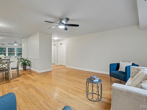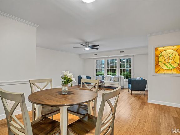 Welcome to easy living in this beautifully updated ground-floor, end unit condo that backs to the 8th fairway of Creve Coeur Golf Course—offering scenic views and unmatched privacy. Step inside to find gleaming hardwood floors, fresh paint, and stylish crown molding throughout. Natural light fills the spacious layout, enhanced by recessed lighting and large replacement windows (nice window treatments too). The inviting sun porch is perfect for morning coffee or relaxing with a book while enjoying the golf course backdrop. The kitchen is a cook’s dream, featuring Corian countertops, KitchenAid appliances, a pantry, and plenty of workspace. The adjacent laundry room adds everyday convenience. The primary suite is a true retreat, complete with a beautifully updated bath showcasing a custom walk-in shower, double sink vanity, and heat lamp for added comfort. Enjoy secure underground parking and a dedicated storage unit, plus the ease of elevator access from the welcoming lobby and vestibule. This well-maintained building offers a rare combination of quiet, comfort, and convenience—all within a serene golf course setting. A unique opportunity to own an elegant, move-in-ready unit in a prime Creve Coeur location. Don’t miss it!
