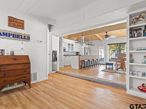 Welcome to this rare waterfront retreat nestled in the highly desirable Crestwood Subdivision on Lake O' The Pines. Step inside to find sweeping panoramic lake views visible through the expansive back windows, creating a stunning backdrop from the moment you enter. This 4-bedroom, 2.5-bath home offers a spacious open-concept design complete with granite countertops, a kitchen island, and elegant laminate wood flooring. A separate storage room with a private entrance on the front left side of the home provides versatile extra space. Recent upgrades include new exterior siding, a brand-new roof, and stylish cosmetic improvements throughout. Relax or entertain on the back deck while taking in the peaceful lakeside scenery. As an added bonus, select furnishings may be included with the sale. Don’t miss your chance to claim this slice of lakefront paradise!