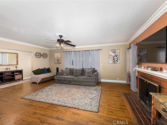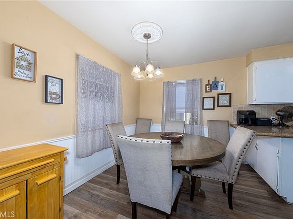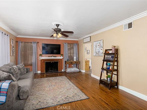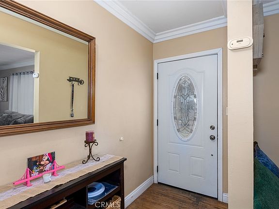 North San Bernardino home situated on an attractive, tree-lined street. This property offers three bedrooms, two bathrooms, a detached two-car garage, and an extended driveway with RV parking. Charming home with stylish light fixtures, granite counter tops in the kitchen and both bathrooms, tile flooring in the bathrooms, hardwood flooring in living room and hall, and stylish wood-laminate in kitchen and laundry room, carpet in all bedrooms. Nice fireplace in the living room, upgraded crown molding throughout, and baseboards/casings. The yard features mountain views, ample space for gatherings, a fire pit, and requires minimal upkeep. Located near Arrowhead Country Club Golf Course, in a desirable neighborhood.