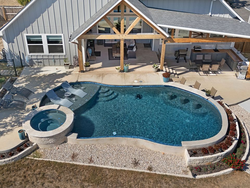 Tucked inside a peaceful gated community, this custom-built home offers luxury, privacy and unforgettable outdoor living. Tile floors run throughout, and the gourmet kitchen features quartz countertops and a large walk-in pantry. A detached game room adds flexible space for entertaining or relaxing. Step outside to your personal resort: a heated and chilled pool with a 17-ft infinity edge, sun shelf, and swim-up bar. Unwind in the 6-person hot tub with waterfall, or host gatherings under the covered patio with full outdoor kitchen. The detached 800 sq. ft. game room/pool house has beautiful views of the backyard and it's own covered back porch. Beyond the pool, a fully fenced yard opens to a dedicated dog run and a lush garden retreat - complete with a greenhouse featuring fruit trees and a 12x16 shed for storage or hobbies. A rare blend of custom design, serene surroundings, and resort-style amenities - All behind the gates.