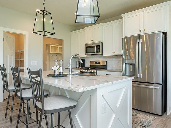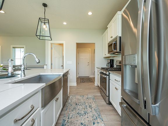 Welcome home! This beautiful property offers a spacious open floor plan with a covered deck where you can relax and take in the peaceful pond views. On the main level, you'll love the generous primary suite - you'll enjoy waking up to pond views every morning - with a tiled walk-in shower, plus the convenience of main-floor laundry connected to the primary suite and the mudroom/drop zone. Two additional bedrooms and another full bath on the other side of the home provide plenty of space for family or guests. The kitchen is a true highlight, featuring abundant cabinetry, quartz countertops, a stylish tile backsplash, and a large island - perfect for both everyday living and entertaining. Gather in the cozy living room around the fireplace set against a chic shiplap accent wall, all while enjoying the stunning view of the pond through a wall of oversized windows in the great room and through the sliding glass door in the dining area. Downstairs, the finished lower level is ready for fun! Host friends and family in the expansive family room with a wet bar and more shiplap charm. You'll also find two additional bedrooms and a ¾ bath in the lower level, offering even more living space. With thoughtful details throughout, ample room to grow, and a passive radon mitigation system already in place, this home truly has it all. Don't miss your chance to see it!