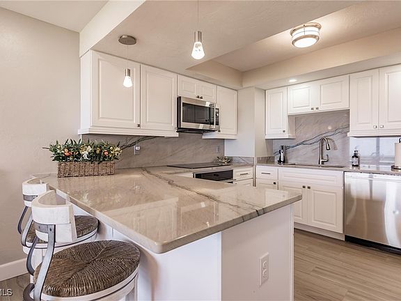 This SPECTACULAR 3-bedroom 15th floor corner ‘sky home’ with incredible views has been upgraded to the fullest! Over 2,500 sqft of luxurious elegance, this coastal-themed property with designer details will captivate you! High-end features of plank tile flooring, a completely renovated kitchen with gorgeous quartz, custom cabinetry, upscale appliances and ample storage. Each of the 2-1/2 baths have been fully renovated w/amazing tile, glass and wood. The huge primary suite w/balcony on the southwest side of the home provides colorful views to Sanibel and the barrier islands. The expansive 60+ ft long main balcony provides outdoor enjoyment and entertainment space with river views as far as downtown Fort Myers. NEW hurricane doors and windows, plus Storm Smart screen protection and new dehumidification unit assures peace of mind. Membership has its privileges, and you get it ALL with this property. Located in The Landings Yacht Golf & Tennis Club, this gated & bundled community has “Best in Florida” tennis and pickleball associations with free access to 16 clay courts and 8 pickleball courts with many different levels and divisions and play. Golf on 18 holes with leagues and open play. Well-equipped sports Pro shops. Deep water Gulf access marina with INCLUDED boat slip for up to a 65’ vessel (subject to wait-list), with a Ship’s store and fuel dock. Top it off with lots of social activities and 2 great dining venues. Owners in Ariel, a luxury high rise atrium-style condominium, enjoy fabulous amenities of 4 guest suites, fitness center with locker rooms and saunas, resort swimming pool and BBQ plaza, gaming and card-playing rooms, ball room/function hall and 3 tennis courts. In addition, under building parking, storage lockers and on-site management complete this amazing package. A great opportunity awaits – come embrace this tropical, fun and luxurious lifestyle!