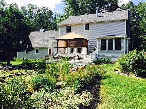 Stunning, Secluded 6.8 lush acres, with a beautifully maintained Cape Cod, Charming front porch, 4BR, 2 full baths, formal din rm, liv rm, fam rm, sunroom, gas brick frplc, every window has a view! Country kitchen w/E-I area overlooking the gorgeous outdoor pond w/cascading waterfall surrounded by plush landscape & gardens galore! Partially finished bsmt w/wine cellar, hardwood floors throughout except tiled kit & bath areas. C/A, 2+ car attached gar w/lg loft area. Shed, gazebo, composite 2 tier deck, large wooded area as well as open acreage. If you want privacy with beautiful grounds this is for you! A Must See.