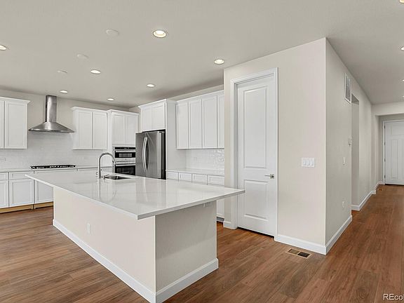 Remarkable large MOVE-IN READY ranch-style home with open floor plan & modern high-end finishes. 5 bed, 3 bath, large finished basement + 2-car garage. Steps away from neighborhood park, Skyline Park, trails, shopping, light rail and highway. Fabulous new home with room to spread out, large great room, dream kitchen, dining room space, and a covered back patio. Never lived-in, brand-new home with many upgrades including contemporary gourmet kitchen with modern design, 36” gas cooktop, built-in oven/microwave combo, 36” designer hood, white premier 42” soft close cabinets, beautiful quartz countertops, tile backsplash, massive island, trash pull out, stainless-steel appliances, walk-in pantry & lots of cabinet space. Master suite with coffered ceiling, walk-in closet, and a deluxe owner’s bath featuring a large soaking bathtub, custom shower with mud set shower pan, modern tile and euro frameless shower enclosure. Iron stair railing, 8-ft interior doors on main floor, central A/C, luxury vinyl flooring, home technology package which includes theater pre-wire for speakers in great room, quartz countertops throughout the entire house, wonderful basement wet bar, upgraded light fixtures & plumbing fixtures throughout, upgraded carpet, ceiling light and/or fan pre-wires in all main floor bedrooms, island pendants pre-wire, additional recessed can lighting throughout the home, upgraded baseboards & doors throughout, 8-ft overhead garage door with garage door opener, sump pump & radon mitigation system. The finished basement features an enormous recreational room, wet bar, 2 large bedrooms, a bathroom & a large storage. Small private yard with nice covered patio. Property backs to a large horse property. The home is still under the builder’s home warranty.