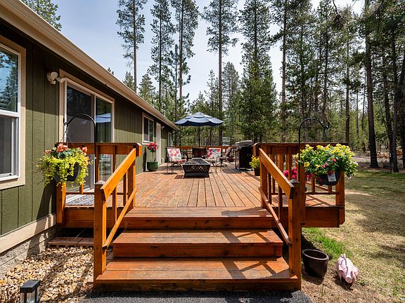 Beautiful 2019 manufactured home on a fenced 1-acre corner lot in La Pine, offering privacy, space, and thoughtful upgrades. The property features a 28' x 25' deep steel carport, 480 sq ft deck perfect for entertaining, and mature trees creating a peaceful setting. An asphalt driveway, resealed in August 2025, leads to the home, with a 200 sq ft storage shed & a 50 amp RV hookup w/ water for added convenience. Inside, enjoy two spacious living rooms, a cozy wood-burning fireplace, built-in shelving, & rich hickory cabinets throughout. The kitchen is open & functional, ideal for hosting or everyday living. Primary separation w/a walk-in closet, double vanity, & a deep soaking tub framed in hickory. Underground sprinklers keep the yard lush & green all summer. This home combines comfort, functionality, & charm-perfect for full-time living or relaxing getaway near Newberry Caldera, Deschutes National Forest, and East & Paulina Lakes!