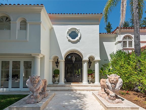 Located in the exclusive guard gated community of Mountain View Estates this furnished 6 bedroom 6 bathroom home offers 6158 sq ft of attractive living space on a corner lot with a circular driveway on a cul-de-sac street. The dramatic 2 story entry features marble floors, crystal chandelier and sweeping wooden staircase. Immediately upon entering you are drawn to a beautiful formal dining room with a crystal chandelier and a wall of windows/doors showcasing the lush backyard and pool. The oversized family room offers built-in cabinets, fireplace, sunken wet bar and hardwood floors. The generous size kitchen has white cabinets, granite countertops, center island, walk-in pantry, marble floors and a large breakfast room. The formal living room boasts a fireplace, gleaming crystal chandelier and marble floors. There is a bedroom suite downstairs with a large bathroom that can also serve as a pool bath with a door to the outside. Upstairs there are 5 bedrooms, all with hardwood floors. The primary suite has a gym area, balcony, fireplace, 2 walk-in closets, and a grand bathroom with dual vanities, spa tub, large shower, and a bidet. The inviting backyard features a large covered patio, pool, spa, and grassy lawns. This beautiful property is being leased furnished short term for 3-6 months. Located in the award winning Las Virgenes school district and convenient to shopping, fine dining, and a short drive to Pepperdine University and the beaches of Malibu.