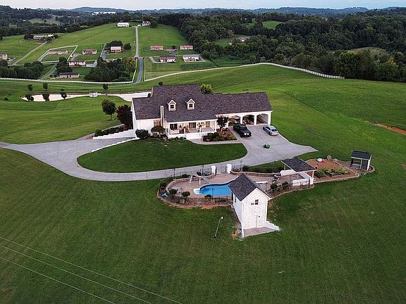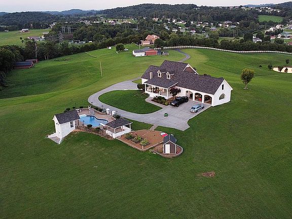Gated entrance to this Custom built estate on over 26 rolling acres with perimeter fencing and pond with dock and gazebo with 2 wells. Travel up the winding drive to meet this grand home and all it has to offer. Begin your journey at the Marble entryway. Visit the Spacious master suite on the main with new bath. See the Cathedral ceilings in family room with fireplace. The home boasts an Eat in kitchen with solid surface countertops, new fixtures and stainless steel appliances. Formal dining area and Den or office area. 1/2 bath with laundry. 3 car main level garage. Continue upstairs to 2 additional bedrooms with a Jack and Jill bath, Dressing/Closet area and bonus room with storage. The full, partially finished basement offers a game room, great room, kitchen/dining area, full bath and 2 car garage. Enjoy the views of Clinch Mountain from the front porch or the sunroom on the back. Relax by the in ground swimming pool which includes a pool house with 1/2 bath. Plenty of room to lounge or entertain around the gazebo at the pool. Additional storage and living area in the detached garage/apartment. 5 bay garage and workshop with a 1 bedroom, 1 bath apartment with 792 sq feet finished. The house is currently getting painted white with more pics to come and new cabinets and appliances installed.