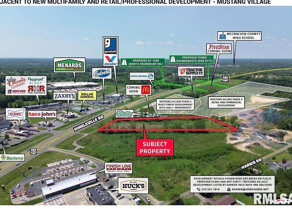 Prime 4.10-acre commercial land for sale in the heart of Paducah's thriving retail and restaurant corridor. Located between Kentucky Oaks Malland the McCracken Co. High School, just 3.5 miles from Barkley Regional Airport. 272' of frontage on US Hwy. 60 W (Hinkleville Rd.). ZonedHBZ and annexed into the city limits. High daily traffic counts of nearly 18,000 VPD, the state road department has tentative plans for a new stoplight outside of O'Reilly's, enhancing accessibility. Site is adjacent to Paducah's newest 30+ acre upscale mixed-use development. Can besold as one tract or subdivided. Priced at $825,000 per acre.