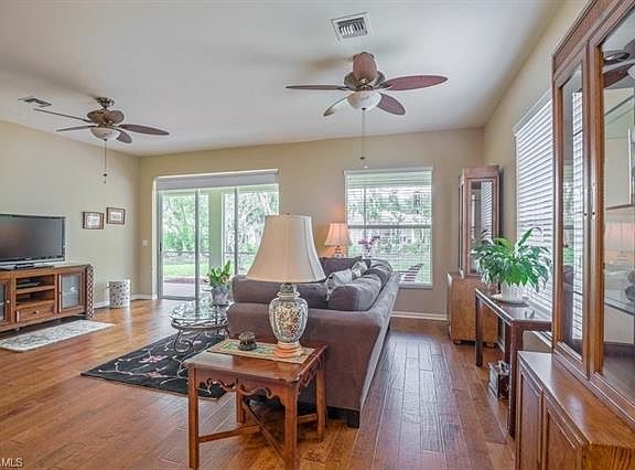 Extremely well maintained villa ready for the new owners. Newer hardwood flooring in main great room along with tile in kitchen area. Nice breakfast bar with large dining area. Single family living, with yard maintenance included, but an extra large yard for pets. Spacious three bedrooms and two baths with over 1800 sq. ft. of living area. Third bedroom has a large closet for storage and French doors for office or den. Step out onto large screened lanai and relax and enjoy peaceful living at it's best.