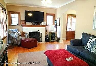 Other notable upgrades include an electric generator hookup and panel, custom gutters with leaf guards on both the house and garage, and new gas and electric lines to the home. The gas fireplace adds a cozy touch to the living area, while the original woodwork, crown molding, classic arched doorways and hardwood floors throughout the main floor of the home bring a sense of character and charm.