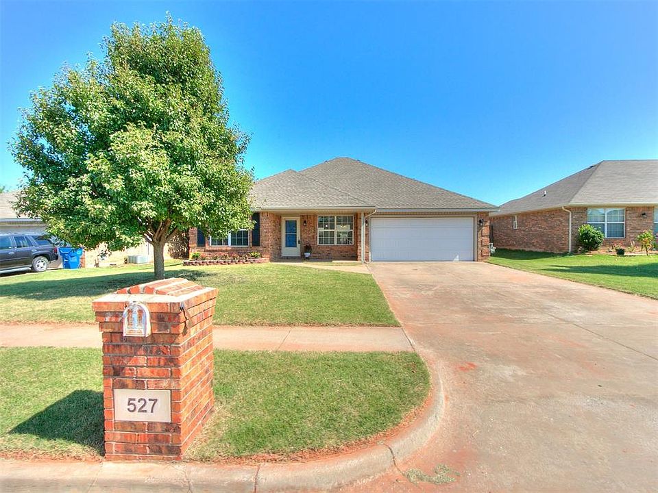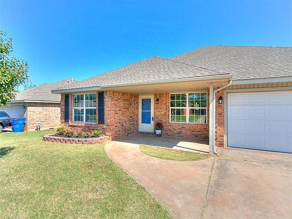 Great, updated 4 bed home in Mustang! New carpet, New stove, New granite in kitchen & baths, New HWT, New roof, New ceiling fans. Living room features wood laminate flooring & ceiling fan. Kitchen has breakfast bar, granite, dishwasher, tile backsplash, new stove & nice pantry space. The primary bedroom has ceiling fan, full bath w/double vanities & walk-in closet. Property has wood privacy fence, covered patio & porch and storm shelter in the garage.