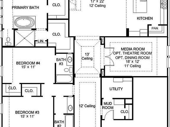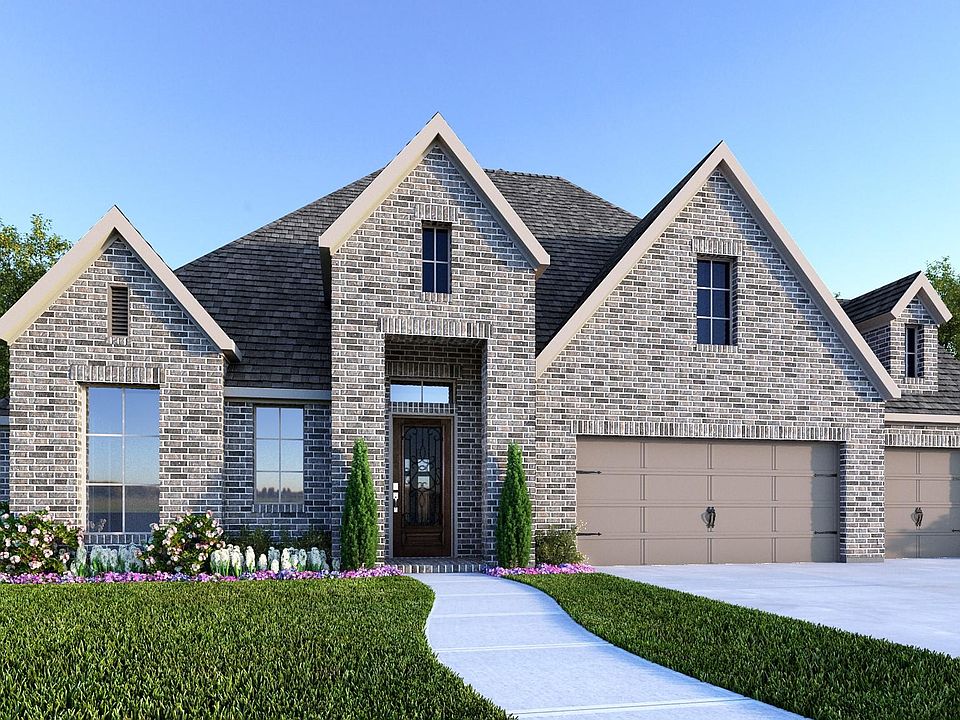 Welcoming entry framed by home office with French doors. Media room with French doors just off the extended entry. Spacious family room with a wall of windows. Island kitchen with built-in seating space and a walk-in pantry. Dining area with walls of windows that offers a backyard view. Primary suite features three large windows. Primary bathroom offers dual vanities, garden tub, separate glass enclosed shower, linen closet and two walk-in closets. Secondary bedrooms with walk-in closets a full bathroom and a Hollywood bathroom complete this generous design. Covered backyard patio. Utility room and mud room just off the three-car garage.