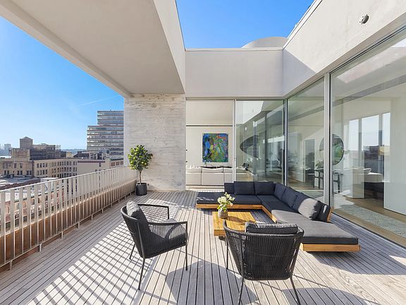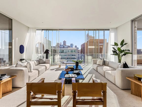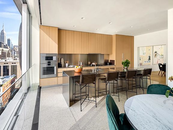 Direct elevator entry leads to a perfectly proportioned, 24'10 x 28'10 living room flanked by two expansive terraces, one of which is a dramatic double-height atrium open to the rooftop terrace above, both accessed by sliding walls of floor-to-ceiling glass and bathed in south-facing light. The west side of the atrium opens to a stunning library with a signature Isay Weinfeld spiral staircase that leads to the private rooftop above, while the southeast terrace opens to an adjoining dining space, creating a one-of-a-kind indoor/outdoor entertaining paradise when all glass walls are open. Accessed through sliding pocket doors off the dining room is an eat-in, custom Isay Weinfeld-designed Molteni kitchen with center island featuring rich light oak cabinetry, high-performance Gaggenau appliance, sleek stainless steel surfaces, and warm terrazzo flooring, and offering access to a third private terrace.