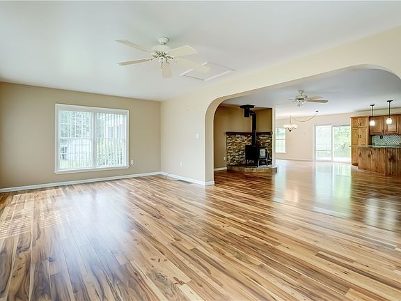 Nestled in a serene, county setting, this 3 bedroom 2.5 bath ranch offers a warm blend of contemporary conveniences and rustic elegance. The open floor plan welcomes abundant natural light while accentuating the spacious living areas. Five well-placed ceiling fans and vertical blinds on most windows ensure comfort and privacy throughout the home.