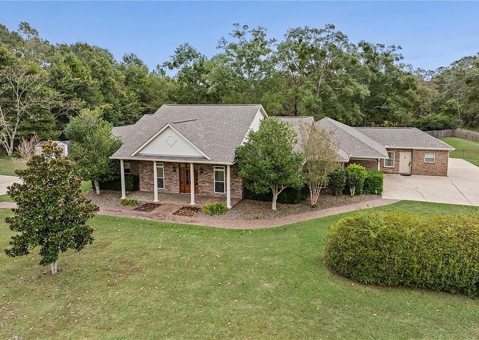 This beautiful custom built one owner home boats a wonderful in-law suite with bedroom, living room, private bathroom, walk-in closets, and kitchen. It is accessible to main space and to a private entrance. The home has wonderful crown molding throughout, tray and double tray ceilings, smooth ceilings, wood blinds, and custom paint. The gourmet kitchen has a granite island with a hand washing sink, double oven, 5-burner gas cooktop, sunny breakfast room, lots of custom cabinets, and a walk-in pantry. The formal dining room is off the inviting foyer and adjoins the spacious family room open to the living area. Sparkling in ground Gunite saltwater pool with decorative stone surround, built in steps, and cleaning filter system. Roof was replaced in 2020, both refrigerators in 2021, both microwaves in 2022, and main house AC in 2021. WHOLE HOUSE GENERATOR was installed in 2022. There are 2 tankless gas water heaters. (All dates per owner). Septic tank was pumped and inspected in 2019. This tastefully decorated home has all the bells and whistles you'll ever need. 10 minutes to the University of Mobile, and 7 minutes to downtown Semmes. It is now annexed into Semmes. Buyer responsible for verifying all measurements and relevant details.