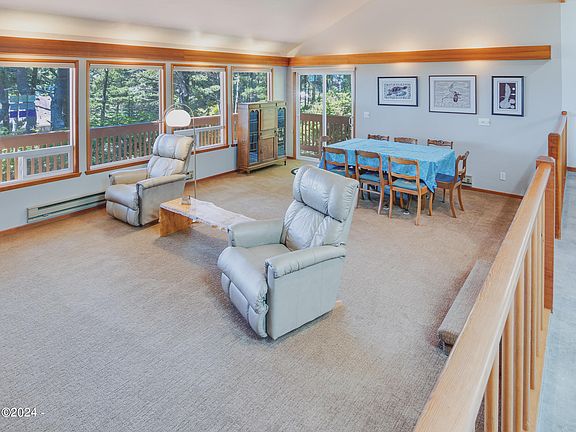 Enjoy whitewater ocean views from most rooms in the house. The large wrap-around deck with a cozy sitting area is perfect for outdoor relaxation. The spacious living room features built-in cabinets and a striking floor-to-ceiling fireplace, while the large kitchen offers plenty of counter and workspace with ample cabinetry for all your culinary adventures. Located just a short distance from public beach access, offering miles of sandy shores to explore from Waldport to Yachats, this home is the perfect blend of privacy, comfort, and natural beauty
