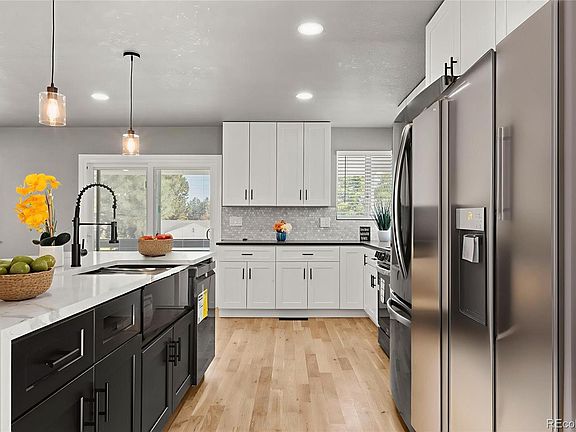 WOW! is what you'll say as you walk in. You'll notice the new open floor plan and all the new finishes. New paint throughout, a completely new and re-imagined kitchen with large island, new cabinets, new appliances, new recessed and pendulum lighting and beautiful natural stone counters. New texture on the walls throughout the home. The new, enlarged primary bedroom has a spa-like primary bath and large walk-in closet. New main bath with a jetted tub. New sliding door off the kitchen leading to a wrap around deck. French doors leading to the additional deck off the dining room with a fireplace for those intimate diners or entertaining friends and family. Gleaming refinished solid wood floors. Downstairs you'll find 2 additional non-conforming bedrooms, (w/o egress windows), and another spa-like bathroom. Lighted mirrors, all new lighting throughout, and freshly landscaped front yard. This one is move in ready and has all the bells and whistles you're looking for.