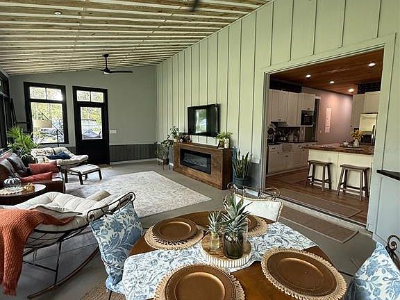 Welcome to your private retreat! Nestled on 5 acres, this modern barndominium offers 2,450 total sq ft of thoughtfully designed living space, including 1,700 sq ft of newly added construction with epoxy flooring. With high-end materials, smart features, and room to expand, this 1-bedroom, 1-bathroom home with a spacious loft is perfect for couples, creatives, or remote workers looking to live comfortably now—with potential to grow. Built to last, this home features the ZIP System wall sheathing for superior air and moisture protection, finished with Hardy siding for a durable, low-maintenance exterior that looks great year-round. In addition, termite bond is already in place for peace of mind. Inside, enjoy an open-concept layout with vinyl plank flooring in the kitchen, bathroom and main bedroom, a stunning Florida room, and energy-efficient spray foam insulation. The master bedroom, kitchen, and bath are equipped with hurricane impact windows, adding comfort and storm-ready security. A smartly designed loft adds flexible space for guests, office, or studio, with additional storage tucked beneath the staircase and upstairs loft area. Outside, enjoy 5-zone irrigation, lush landscaping, and a peaceful pond. A large rear barn with A/C and electric, plus a new outdoor shower and water softener system. Another feature of the rear barn includes an automated screen/roll-up door that opens the space to the outdoors at the push of a button, perfect for a workshop, studio, or business space. In addition to the barn the property also offers a separate smaller storage shed, powered with electricity. Don’t miss out on this rare opportunity – schedule your private showing today!