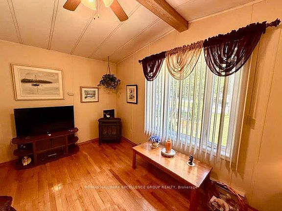 Welcome to this charming 2-bedroom mobile home on leased land, offering comfort and functionality in a peaceful and private setting. The inviting living room features hardwood flooring and a cozy propane fireplace, while the bright eat-in kitchen is perfect for everyday meals. The spacious primary bedroom boasts a wall-to-wall closet, and the main bath conveniently combined with the laundry area. Step outside to enjoy a covered/enclosed patio overlooking a large private yard, ideal for outdoor relaxation or entertaining. A rare find, this property includes a back-to-back double garage (9.15m x 4.55m) and an oversized driveway with parking for at least 10 vehicles. A wonderful opportunity for buyers seeking space, comfort, and exceptional value! Access to all of campground facilities including a restaurant, salt water pool, pond and beach area, petanque, shuffleboard, pickle ball court, beach volleyball and even a park. Planned activities every weekend of the summer.