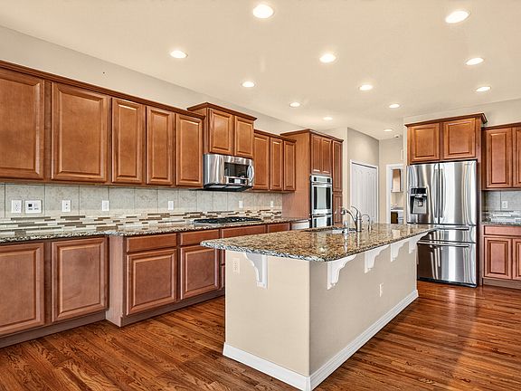 Welcome home to this amazing 4-bedroom, 3-bath ranch-style retreat located in the highly sought-after Cordera community where comfort, luxury, and convenience come together. Located in desirable school district 20, this beautiful home offers 3960 square feet of thoughtfully designed living space on a spacious 9,000-square-foot lot, showcasing breathtaking Pikes Peak views from the partially covered maintenance free deck. The open-concept layout features a large dining room with hardwood floors, a gourmet kitchen complete with dovetailed, soft-close handsome wood cabinetry, granite countertops, a gas cooktop, double ovens, and a large walk-in pantry a dream for any home chef. The inviting vaulted living area includes a cozy gas log fireplace with stone accents, built in bookcases, and gleaming hardwood floors, and lots of south facing windows. The large primary suite provides a private sanctuary for relaxation and adjoins a 5 piece bath featuring his and her closets. An additional bedroom and full bath grace the main level. A spacious main-level laundry room with sink and storage adds everyday convenience.The home also includes two attached garages, one of which is heated, ideal for winter comfort or use as a workshop. Its stucco and stone exterior offers timeless curb appeal, complemented by energy-saving solar panels. The garden level basements houses 2 additional bedrooms, lots of living space, wet bar and plenty of unfinished storage. Residents of Cordera enjoy access to an exceptional community center featuring modern fitness rooms, a resort-style pool, and walking trails. The home is within walking distance of top-rated schools and conveniently close to hospitals, parks, and shopping. Combining style, space, and location, this stunning home is the perfect place to experience luxury Colorado living with mountain views.