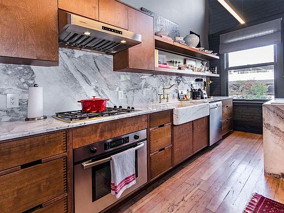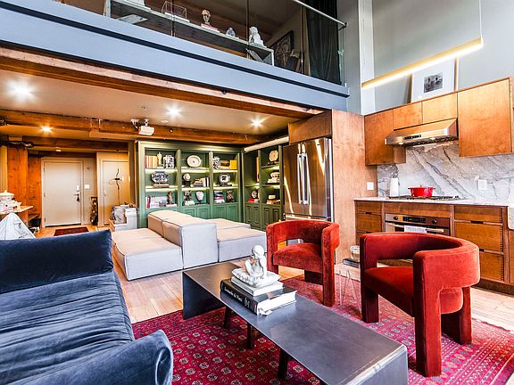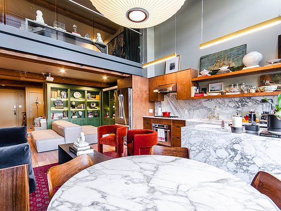 This two-storey loft at the iconic Bowman Lofts is a masterclass in style. Heritage charm meets modern refinement: exposed brick, whitewashed hardwood floors, and 20-foot ceilings with timber beams that add warmth and character. The updated kitchen features Italian Arabescato Corchia marble, walnut cabinetry, and Bosch appliances. Custom millwork bookshelves surround a reimagined area to unwind - EASILY CONVERTIBLE BACK TO A SECOND BEDROOM. Upstairs, the generous suite with secondary entrance offers custom cabinetry, luxurious curtains, and a thoughtfully redone ensuite with double sinks. The two FULL bathrooms showcase Spanish Crema Marfil marble and Toto fixtures. Secured parking within the building, storage locker, and a rooftop fireside lounge complete this one-of-a-kind opportunity.