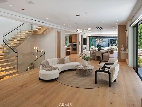 Set behind a canopy of mature olive trees that lend both shade and privacy, this newly built architectural residence spans approximately 7,700 square feet across two levels and a full basement. The main level unfolds with dramatic scale, offering expansive living, dining, and family rooms anchored by a sleek fireplace and framed by soaring floor-to-ceiling windows that flood the interiors with natural light. A flexible office or guest suite with an adjoining three-quarter bath enhances the layout. The gourmet kitchen is a statement in design, appointed with bespoke DOCA cabinetry, quartz countertops, a professional 6-burner cooktop with hood, Miele double ovens, wine refrigerator, beverage center, microwave, and a generous sized pantry. Upstairs, three spacious en-suite bedrooms include a tranquil primary suite featuring a fireplace, private balcony, custom oversized closet, dual sinks, freestanding soaking tub, and a luxurious rain shower. A serene hallway patio and a second laundry room add both style and convenience. The lower level is dedicated to leisure and wellness, boasting a state-of-the-art theater, fitness studio, wet bar, sauna, steam shower, bedroom with en-suite bath, custom built-ins, and a refined fireplace. Outdoors, the resort-style backyard is designed for entertaining with a sparkling pool and spa, barbecue island, mini-fridge, and a two-car garage. A private junior ADU suite offers further versatility with a kitchenette, stacked washer/dryer, three-quarter bath, balcony, and dramatic floor-to-ceiling windows. Additional highlights include wide-plank hardwood and stone flooring throughout, elevator access to all levels, and a fully integrated Crestron smart home system. Located on one of Santa Monica’s most desirable streets, just moments from Palisades Park, the beach, fine dining, and luxury shopping.